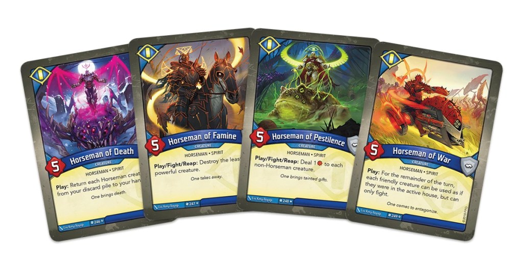 At the start of your turn, you will choose one of the three Houses within your deck and activate it. Once you have declared your active House, you may only play and use cards from that House, so be sure to choose wisely. Though you only can activate one House per turn, you’re free to use those cards as you please: no cards have a cost in KeyForge, so you can use your active House to run wild, playing and using cards without limit. At the end of your turn, you will draw back up to a full hand of six cards, so it may be best to play as many cards from your hand as possible. Then again, you may want to hold your best tricks back so you can get their full impact at the opportune moment! And that’s just the start of the tactical choices to make in every turn of KeyForge.